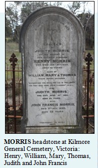 Judith Morris died at her residence Vauclaus, Richmond in 1885 aged 65, and was buried in the Catholic section of the Kilmore General Cemetery with her husband Henry, their three infant children William, Mary and Thomas, and their son John Francis Morris.